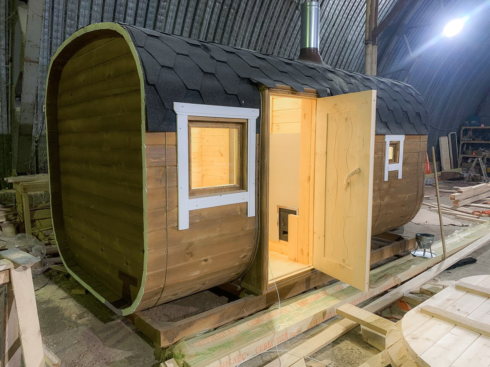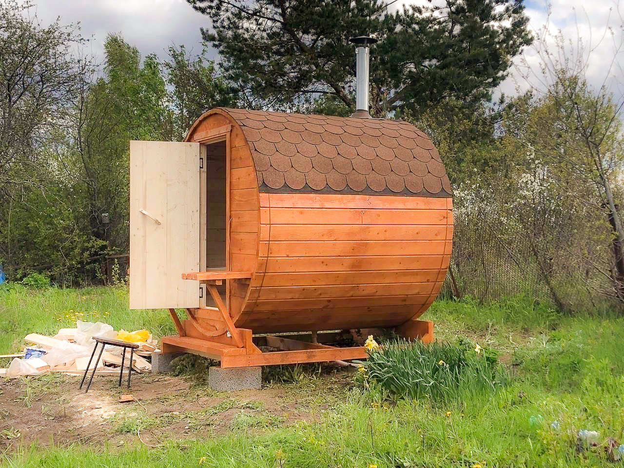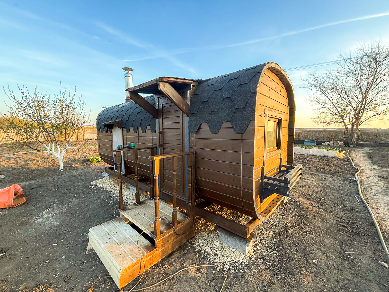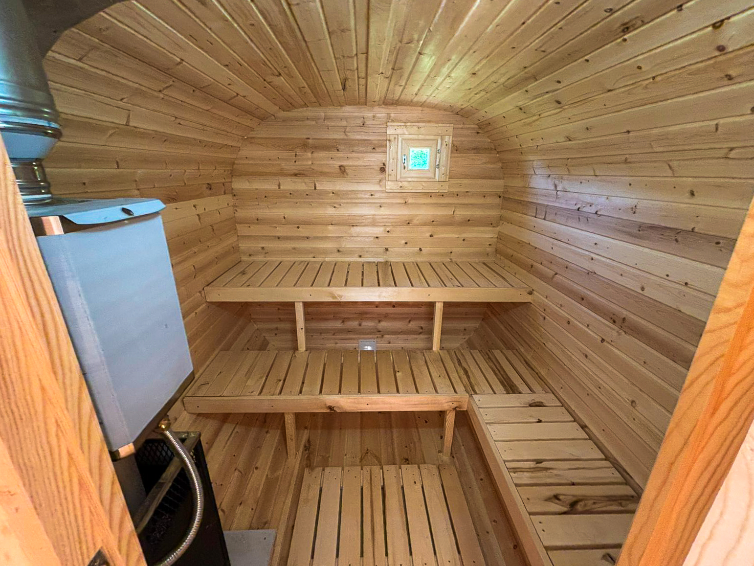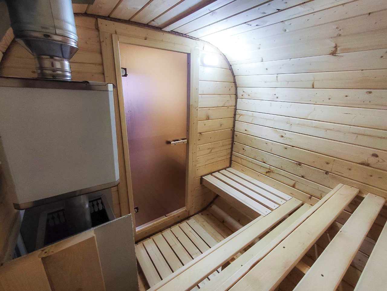 - Высота: 2,5 м снаружи / 2,3 м внутри — просторнее стандартной бочки;