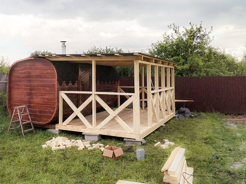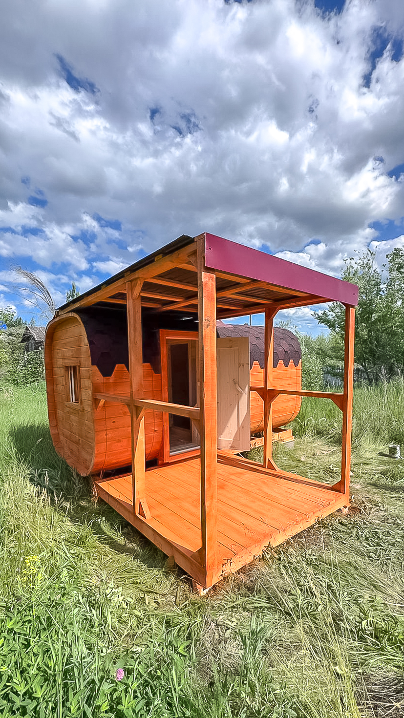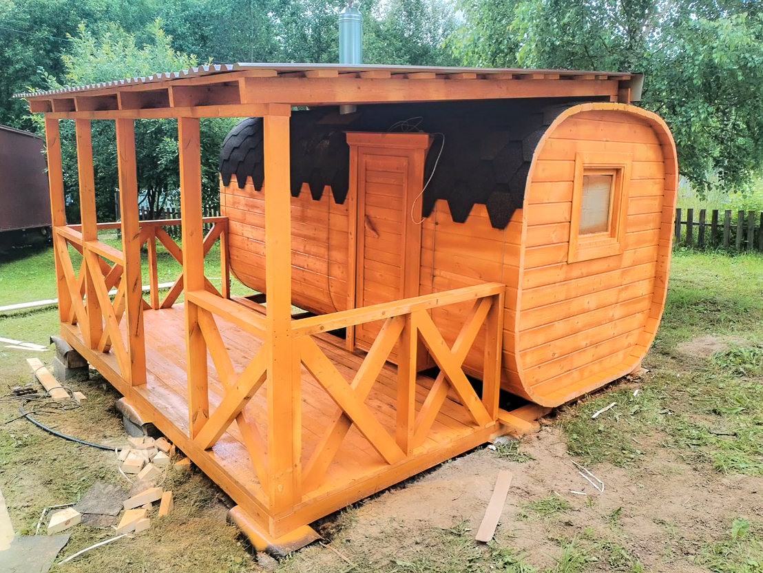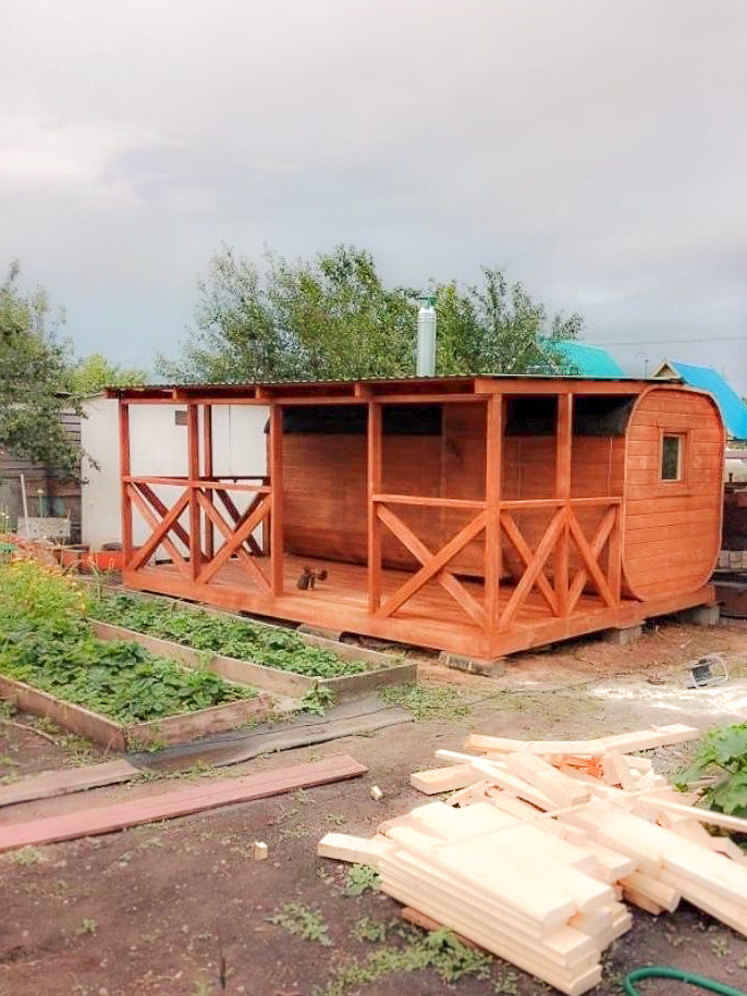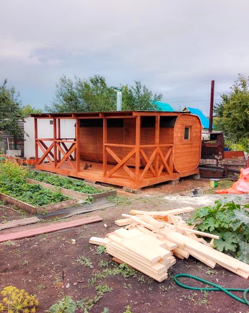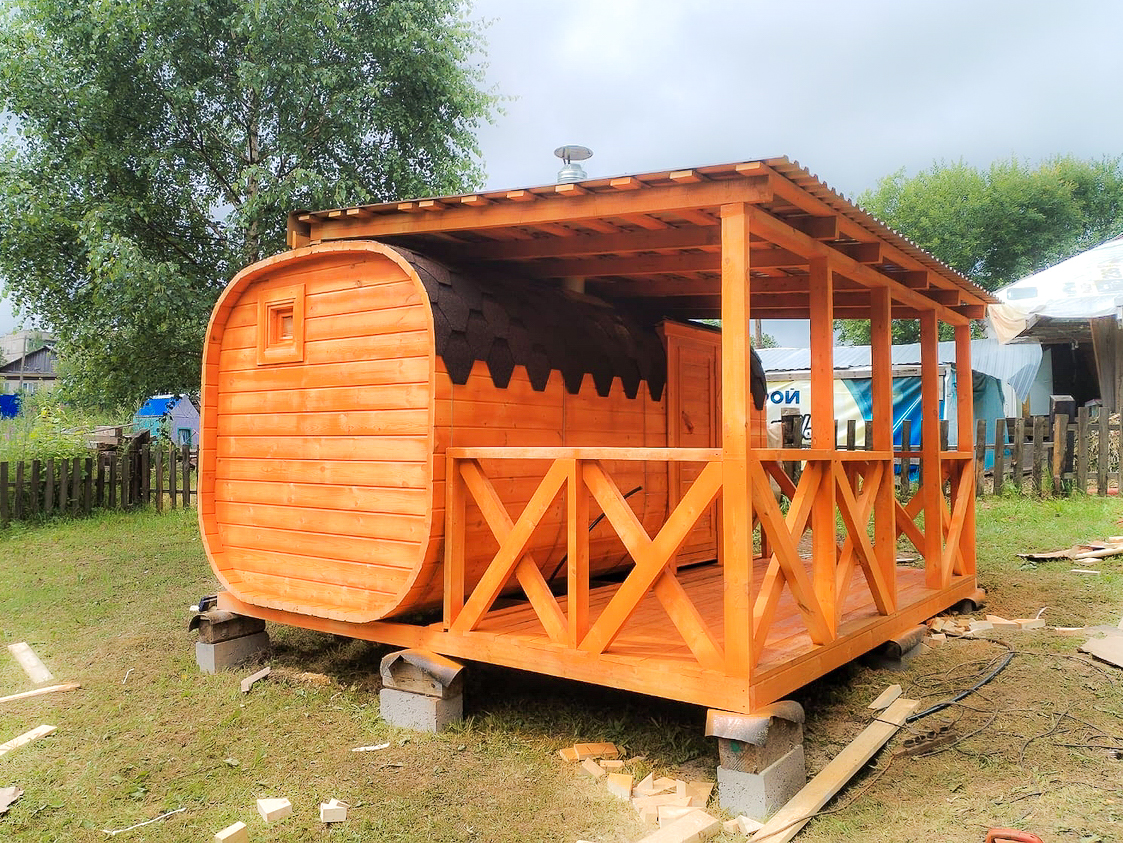 Баня-бочка с террасой
