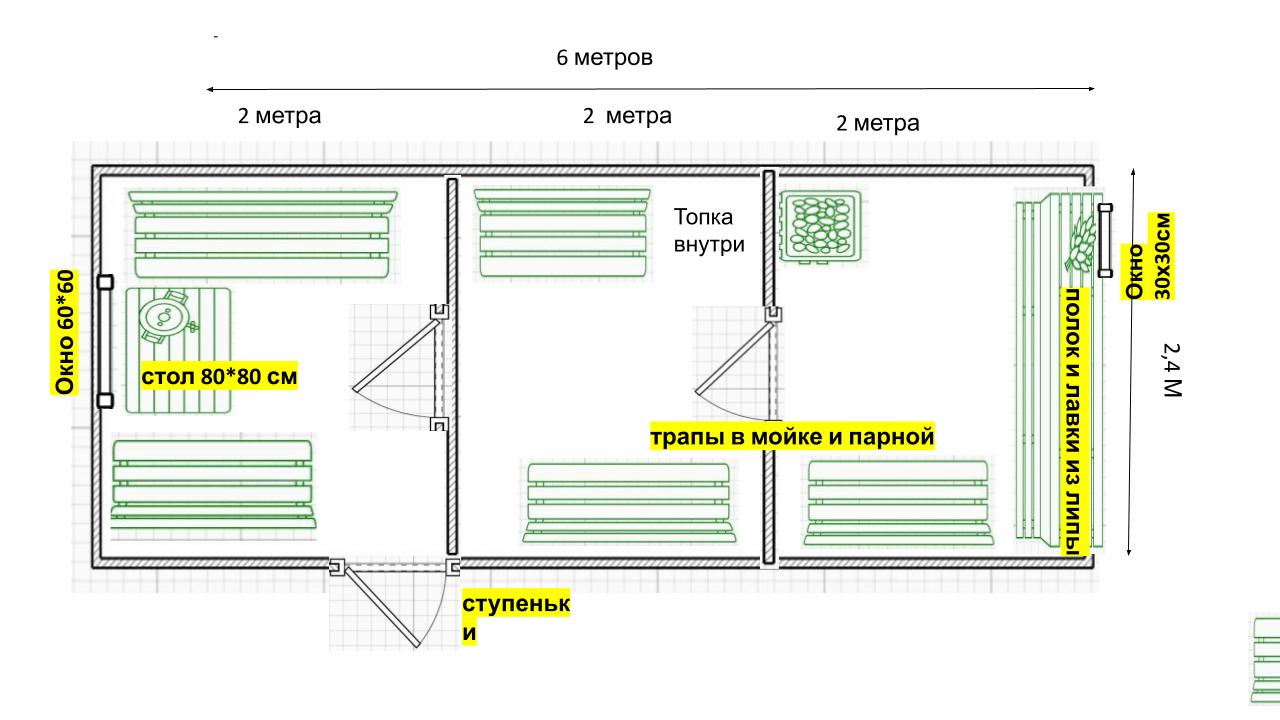 [+ помывочная]; - Вместимость: до 6–8 человек (зависит от размера);