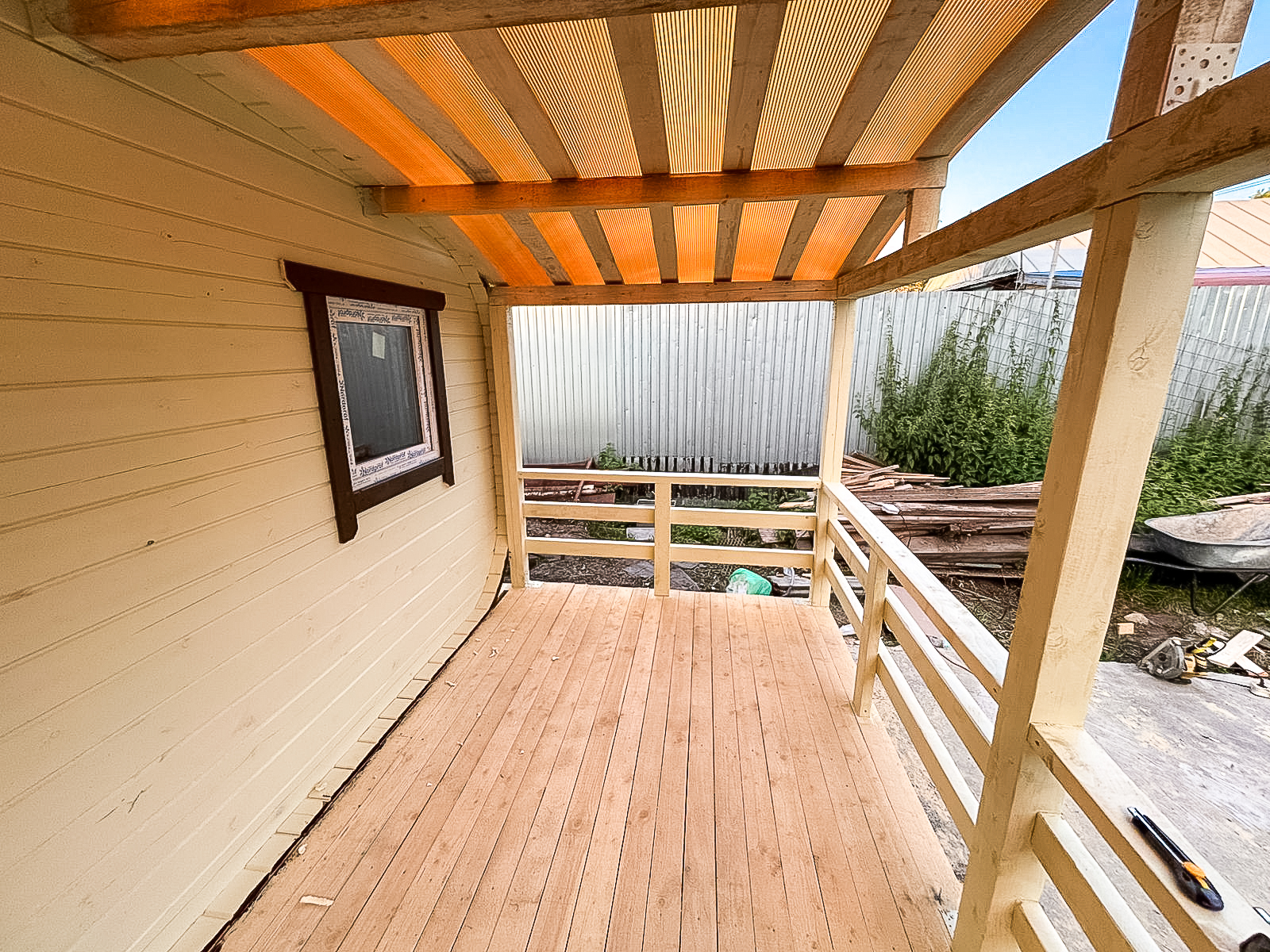 - Терраса: деревянный настил + крыша + ограждение